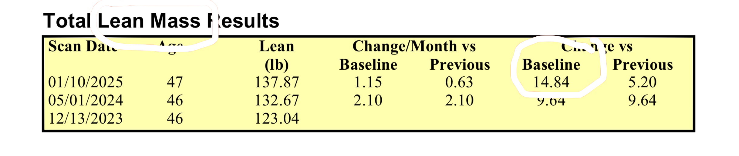 But the results told a different story. After just one year—roughly three to four days a week of structured training—the progress was remarkable. While many saw great success, one executive topped the charts with a fifteen-pound gain in lean tissue in twelve months (see image below). Even more compelling, his VO₂ max improved by nearly eight percent, showing that the new tissue wasn’t just for show—it was functional. It moved the needle in endurance, resilience, and performance under stress. Critics might debate the minutiae, but at some point, the outcomes speak louder than the arguments.